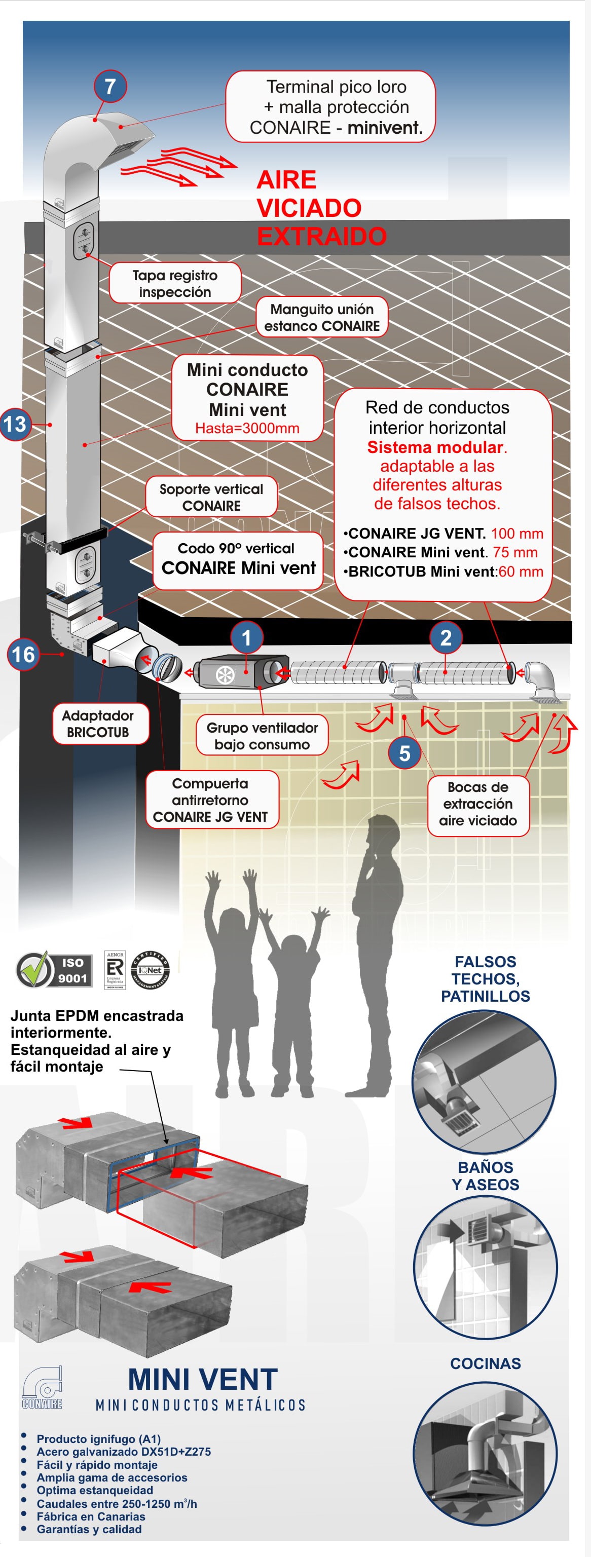 En este caso, CONAIRE Factory propone una amplia gama de productos para conformar la red de conductos de dichos sistemas. Para un residencial unifamiliar encontramos los conductos rectangulares CONAIRE – MINIVENT, fabricados en acero galvanizado, perfectos para pequeños caudales e instalados en falsos techos para la evacuación del aire viciado.