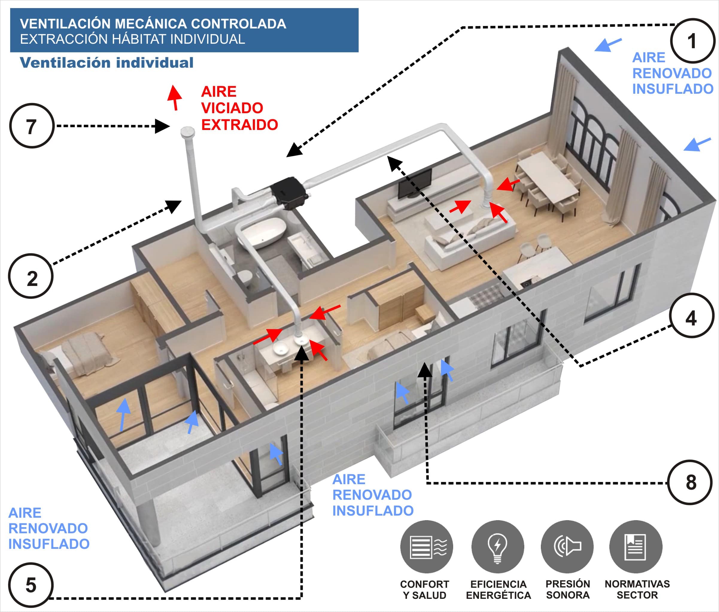 El aire viciado se procede a extraer por las estancias húmedas (cocinas, cuartos de baño, aseos) mediante bocas de extracción conectadas por conductos al grupo de ventilación. El nuevo aire del exterior entra por los aireadores que están colocados encima de las ventanas de las estancias secas (dormitorios, salas de estar, comedores…). Así habrá una continua renovación del aire en el interior de la vivienda.